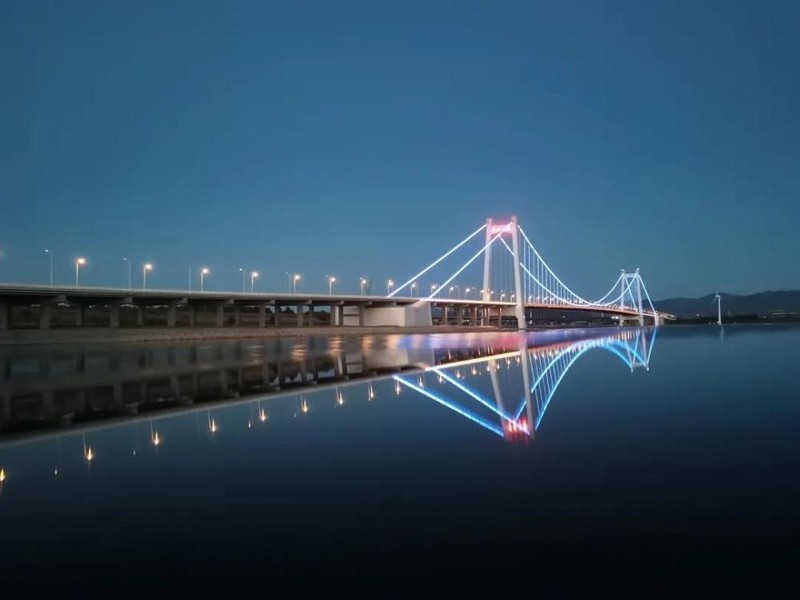怀来大桥位于河北省张家口市怀来县境内官厅水库水道之上,全桥采用双向4车道城市主干路标准建设,设计时速60公里/小时,设计为双塔单跨悬索桥,全长1988米,桥主塔高107.8米,桥宽33.6米。主桥720米一跨过湖,大桥南北两岸引桥各634米,为我国华北地区第一跨度的悬索桥。