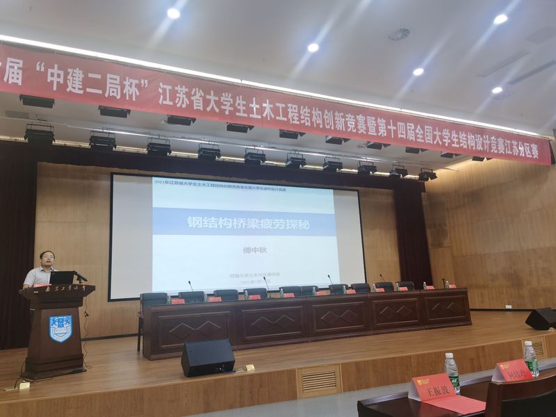 2021年7月15至17日,第十七届江苏省大学生土木工程结构创新竞赛暨第十四届全国大学生结构设计竞赛江苏分区赛,在南京工业大学浦口校区隆重举行。课题组傅中秋老师在17日学术报告环节,为参赛学生做了《钢结构疲劳探秘》的大会报告。