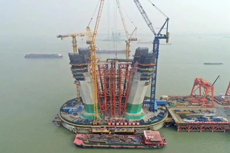 目前,常泰长江大桥泰兴侧所有桩基基础、承台均已施工完成。5号墩主塔已完成下塔柱四塔肢1-7节混凝土浇筑,正在进行横梁支架搭设,下一步将进行横梁施工。天星洲专用航道桥正在进行墩身及钢桁拱临时墩施工,3号墩计划1月初完成墩顶横梁施工,下一步将进行钢桁拱起始节间架设工作。大桥公铁合建段引桥正在进行墩身施工及首跨下层公路节段梁架设,下一步将横移进行下层铁路梁段架设。