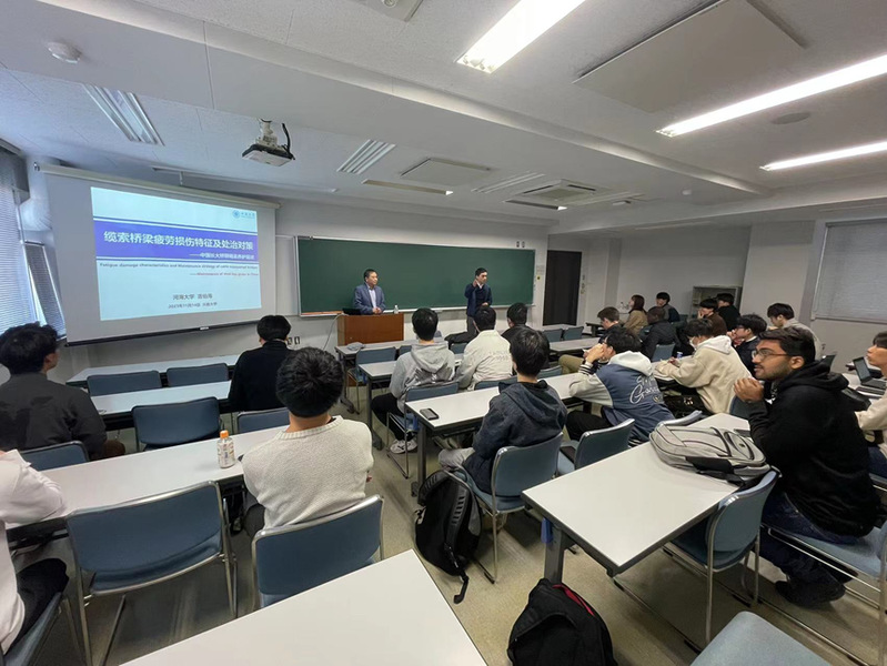 20231029日至1119日,受日本大阪大学Mikihito Hirohata准教授的邀请,课题组吉伯海教授在大阪大学开展了为期三周的访学交流活动。1114日,吉老师为工程研究生院全球建筑系部分教师与研究生作了题为“缆索桥梁疲劳损伤特征及处治对策——中国长大桥钢箱梁养护现状”的学术报告。
