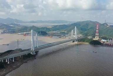 作为甬舟铁路的关键性工程之一,桃夭门公铁两用大桥全长1534米,其中公铁合建段长1066米,连接册子岛和富翅岛。主桥采用主跨666米混合箱梁斜拉桥,是世界首座三箱分离式混合梁斜拉桥;公、铁采用平层布置,铁路布置在中间,公路分幅布置在两侧,是世界目前最大跨度公铁两用混合梁斜拉桥;中跨主梁采用分离式钢箱梁,边跨主梁采用混凝土箱梁,梁宽66米,是世界目前最大宽度分离式混凝土箱梁。