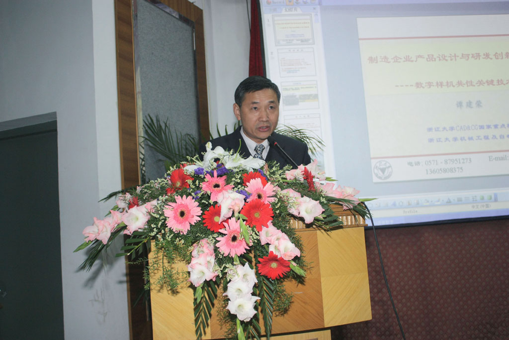 谭建荣院士重点就数字化设计与数字样机研究的相关背景、国内外研究现状、关键技术与解决方案、典型工程产品应用四个方面为到场听众作了精彩的报告。谭院士认为,虚拟现实与设计技术的融合,是设计史上一场划时代的革命,虚拟现实的沉浸性能使人类对事物的感知仿佛身临其境。谭院士还综述了国内外在航天、军事等领域的相关研究现状,指出其从数值仿真发展到图像仿真、从几何建模发展到物理建模、从阶段性设计性能模拟发展到产品全生命周期模拟的趋势和特点。通过多年的研究与实践,谭建荣院士提出并实现了五大数字化设计与数字样机关键技术:复杂装备数字样机的集成平台构建技术、结构变形设计技术、性能耦合分析技术、装配过程模拟技术以及制造布局仿真技术,从而解决了系统集成、结构设计等一系列相关关键问题。最后,谭院士为我们展示了多个典型的虚拟现实应用实例,其中重点介绍了某发动机的虚拟装配过程。