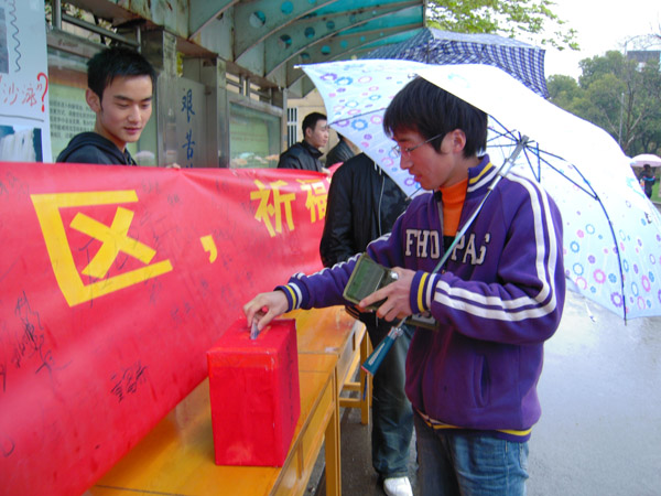 虽然天公不作美,下着大雨,但是丝毫没有影响同学们的热情,依旧有一顶顶雨伞聚集在捐款箱前,踊跃奉献出自己的一份爱心,并在宣传横幅上郑重地写下自己的名字,送上自己最真诚的祝愿,以这种方式为灾区人民祈福。本次活动在机电学院党委的支持以及学校广大师生的响应下,共募集人民币三千余元,所筹善款将直接捐给受旱灾区学校,用于帮助学生完成正常学业。