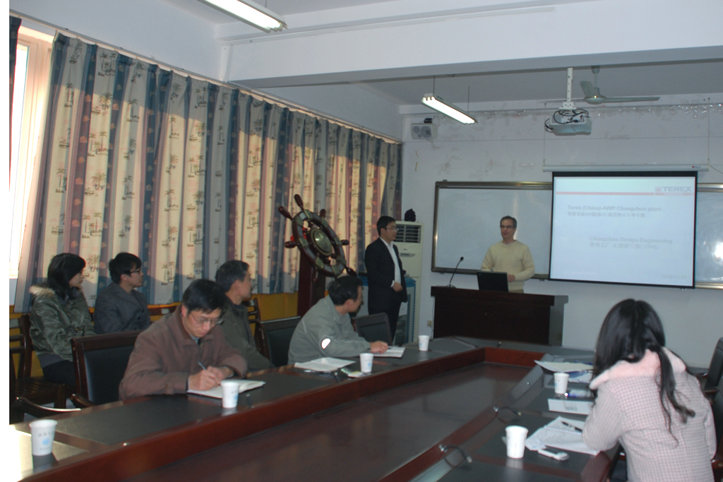 朱天宇院长首先向客人介绍了机电工程学院教学、科研以及人才培养等方面的基本情况。李克坚总监介绍了特雷克斯(常州)机械有限公司的主要产品和相关技术特点,并且提出特雷克斯计划将在常州成立亚太地区研发中心,急需高层次的人力资源和技术支持。