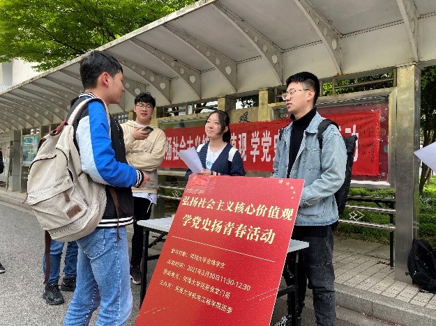 在中国共产党成立100周年之际,为了弘扬社会主义核心价值观,营造爱国爱党的良好氛围,3月30日,机电工程学院团委举办了党史学习教育之“弘扬社会主义核心价值观,学党史扬青春”活动。