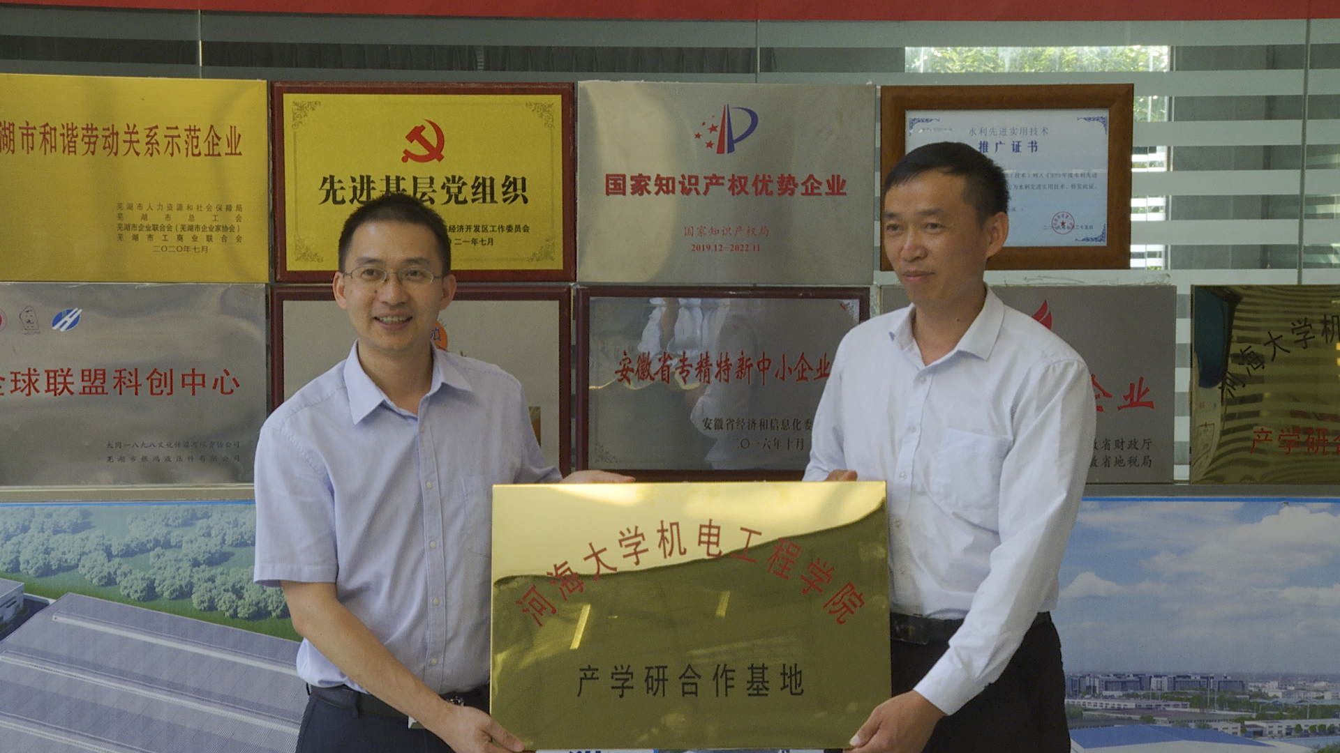 座谈会后,双方举行了开云电竞网机电工程学院与芜湖市银鸿液压件有限公司产学研合作基地揭牌仪式;在陶庭鸿总经理带领下,丁院长一行参观了芜湖市银鸿液压件有限公司生产车间、新建生产基地。