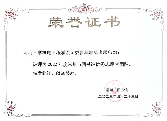 常州市图书馆授予的“2022年度常州市图书馆优秀志愿者团队”称号不仅是对机电工程学院团委青年志愿者服务部的认可,更是对参与活动的每一位志愿者的认可。志愿服务是连接青年个体与社会的重要桥梁,增强了校内学生与社会的交流,大大激发了河海学子的志愿热情。同时,志愿者们也在奉献爱心、服务社会的过程中实现了自我精神世界的提升。