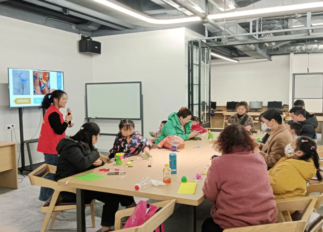 此外,学院团委青年志愿者服务部还与常州市图书馆联合开展亲子手工志愿活动。活动内容为剪纸、画画、变废为宝等简单的手工项目。志愿者们前往常州市图书馆,为参加活动的小朋友们科普有关手工制作和环境保护的知识,并和家长一起帮助小朋友动手完成各项手工。