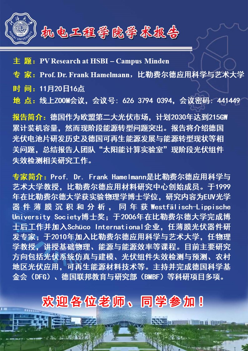 【机电大讲堂】PV Research at HSBI – Campus Minden
