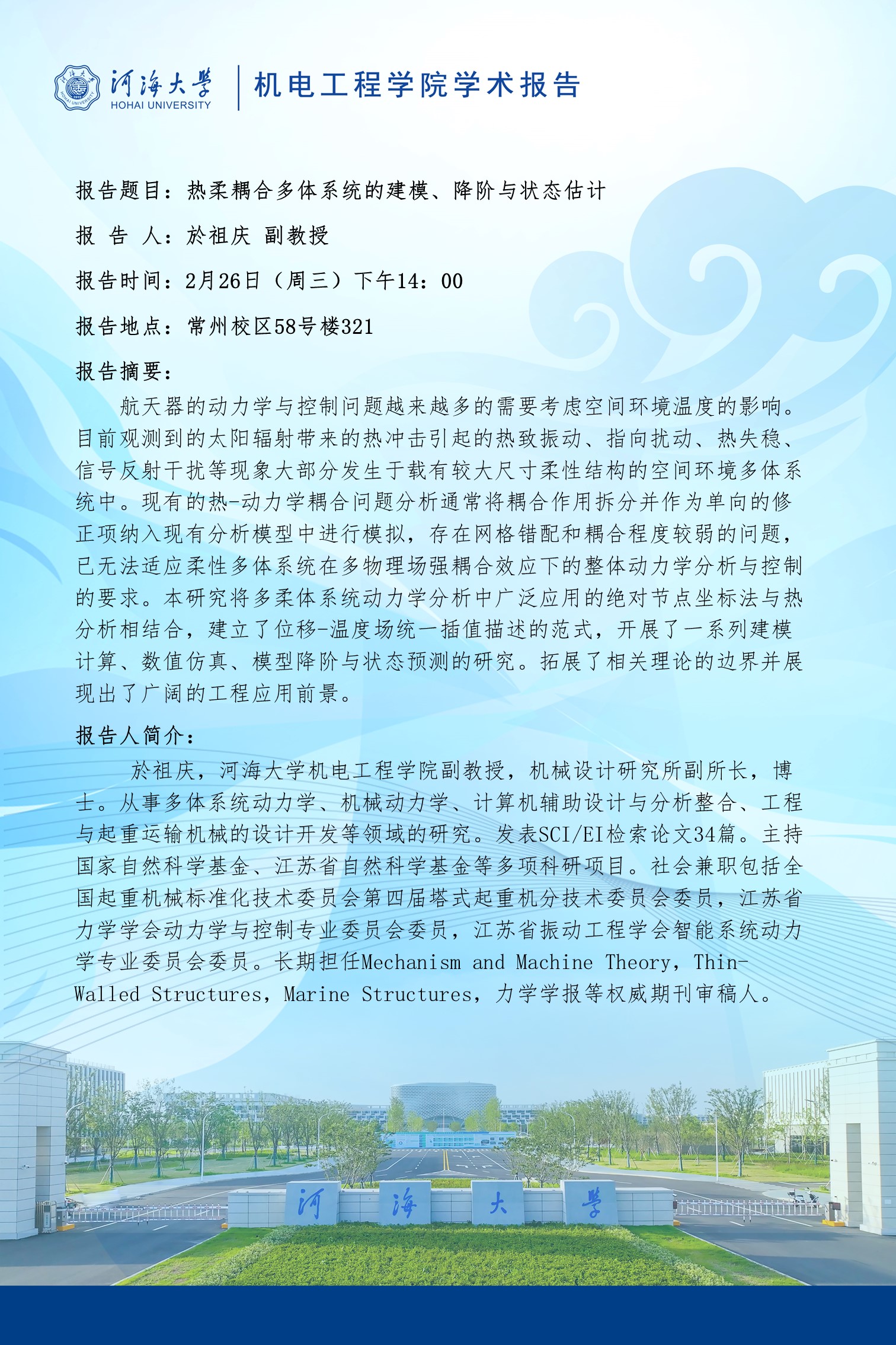 学术报告:热柔耦合多体系统的建模、降阶与状态估计