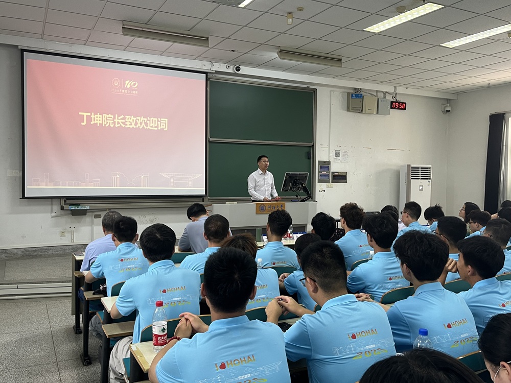 在庄严的国歌声中,大会正式拉开帷幕。丁坤院长首先代表学院致辞,对292名新生的到来表示热烈欢迎,并简要介绍了学院的发展历程、学科建设、师资队伍及人才培养成果。他勉励同学们尽快适应大学新环境,珍惜宝贵的学习时光,夯实专业基础、拓展综合能力,同时注重个人品格的锤炼与集体精神的培养。他还希望同学们传承河海精神,将个人成长与国家发展需要紧密结合,在实现制造强国战略的进程中勇担使命,以奋斗之姿书写无悔青春。
