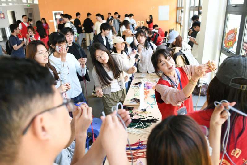 在绘扇体验区,参与者们可以在扇面上绘制自己喜欢的图案。绘扇是一项古老而精美的艺术活动,以涂饰、绘画和精细工艺将扇子装饰得独一无二。首先,同学们选择自己喜欢形状的团扇,然后根据自己的设计理念绘制图案,诸如花鸟、山水或草木。有的同学还会写上祝福语,表达期许。在完成绘画后,同学们使用提供的干花进行加工和装饰,修整并加上饰边,制作成令人赏心悦目的扇子。同学们创作出独一无二的艺术作品,感受到传统绘画艺术的魅力。