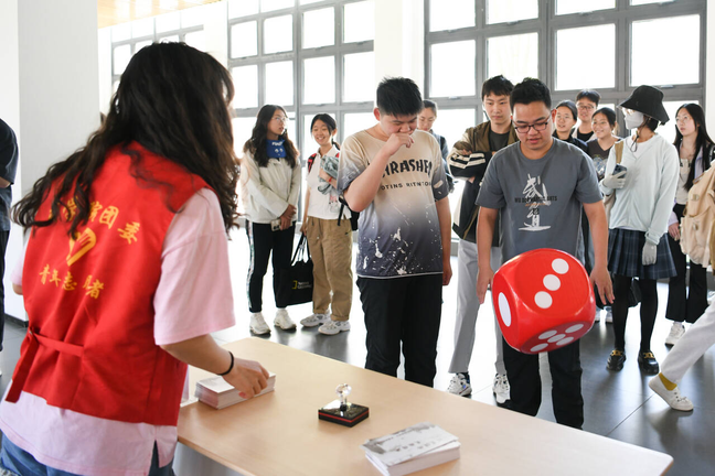 为增加活动的吸引力及趣味性,团委志愿者部设计了新颖有趣的活动参与形式。参与者们在文韵引导处领取盖章卡片之后,可以根据投掷的骰子数前往对应的摊位进行深度体验。每个不同的摊位上有不同的文化印章,所有拿到集章卡片的同学均可前往对应摊位盖章。