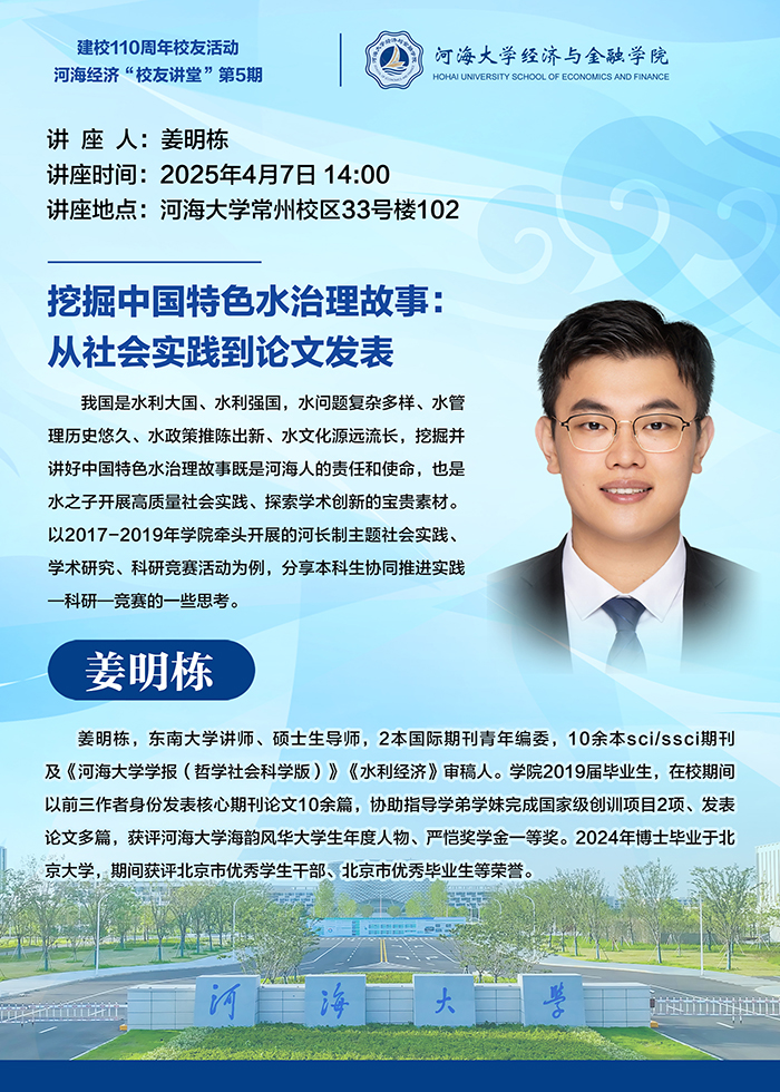 为庆祝建校110周年,持续加强与校友的沟通联系,充分发挥校友榜样引领作用,4月7日,经济与金融学院举办河海经济校友讲堂第5期《挖掘中国特色水治理故事:从社会实践到论文发表》。本期河海经济校友讲堂邀请学院2019届校友姜明栋担任主讲人。姜明栋校友结合本科期间参与学院牵头开展的河长制主题社会实践、学术研究、科研竞赛活动为例,与同学们分享自身对协同推进“实践-科研-竞赛”的思考。姜明栋以太湖蓝藻治理为例,剖析河长制从地方试点到全国推广的实践成效,强调其在破解“九龙治水”难题中的制度创新价值。他重点介绍了开云电竞网“河长制”学生团队自2017年以来的社会实践成果,学生团队深入江苏盐城、常州等地,聚焦农村水环境治理、河长制实施现状等议题,开展数十项调研项目,形成多篇核心期刊论文及政策建议,获常州市、盐城市水利部门采纳。相关成果被《中国水利报》《生态经济》等刊载。姜明栋校友提出水治理研究需“走出去”实践,结合政策热点与地域特色;鼓励学生把握时代机遇,以问题为导向,将调研转化为学术创新,助力中国水治理体系。姜明栋,现任东南大学讲师、硕士生导师。学院2019届毕业生,在校期间以前三作者身份发表核心期刊论