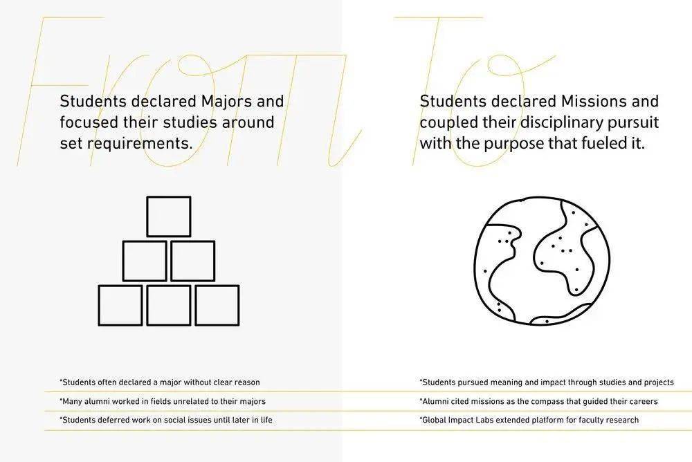 传统大学的学生对于自己所学专业的目标和使命不是很清楚,“校内学习”和“毕业就业”之间形成了很大的断层——通常学生们在毕业的前12年都会十分迷茫,只知道“我的专业可以在毕业之后为我带来什么”,而忽略了专业所能够带来的责任感和使命感。