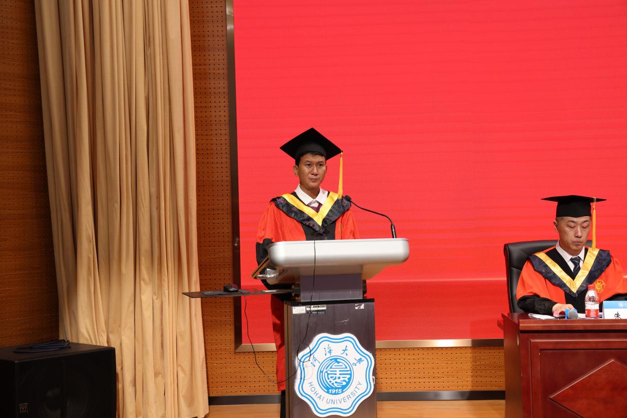 典礼嘉宾、2011届高等学历继续教育水利水电工程专业本科班杰出校友冯自祥董事长向毕业生们表示最诚挚的祝贺,向母校和老师们致以最崇高的敬意。他与毕业生们分享了自己在河海的求学经历和创立云南民鼎集团有限公司的工作经历,勉励同学们踏浪而行,做一朵江河湖海奔涌的浪花,向着广阔无垠的星辰大海扬帆远航。