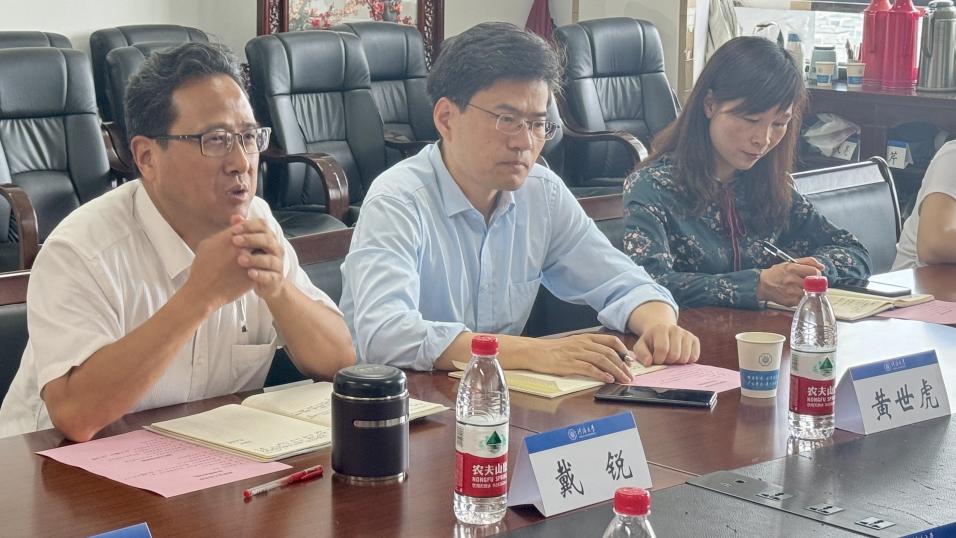 黄世虎对两方的到来表示热烈欢迎,并对三方未来的合作前景进行了展望。他指出,马克思主义学院将积极推动现有课程体系与继续教育发展需求的有机融合,深入贯彻立德树人宗旨,实现继续教育思政课程全覆盖。戴锐详细介绍了马克思主义学院的发展现状与学科特色,希望与国内合作发展处和终身教育学院在学院学术资源整合、校友会建设、院史建设、科研项目申报、思政课程实践教学等领域开展广泛合作,共同开辟发展新领域新赛道,塑造发展新动能新优势。