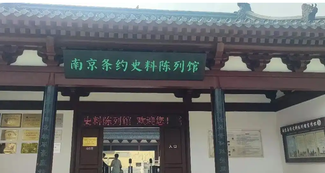 《南京条约》史料陈列馆位于南京市狮子山西麓的古静海寺遗址上,该馆通过4个展厅共130余幅(件)图片、史料和实物,向人们展示了英帝国主义侵略中国,腐败的清政府屈膝求和、割地赔款这一中国近代史上屈辱的一幕。馆内新增的条约陈列室,陈列着我国近代(至1949年)与外国政府签订的1100多个条约,其中大部分是不平等条约。所有这些,时刻在警示后人应牢记“落后就要挨打”的历史教训。