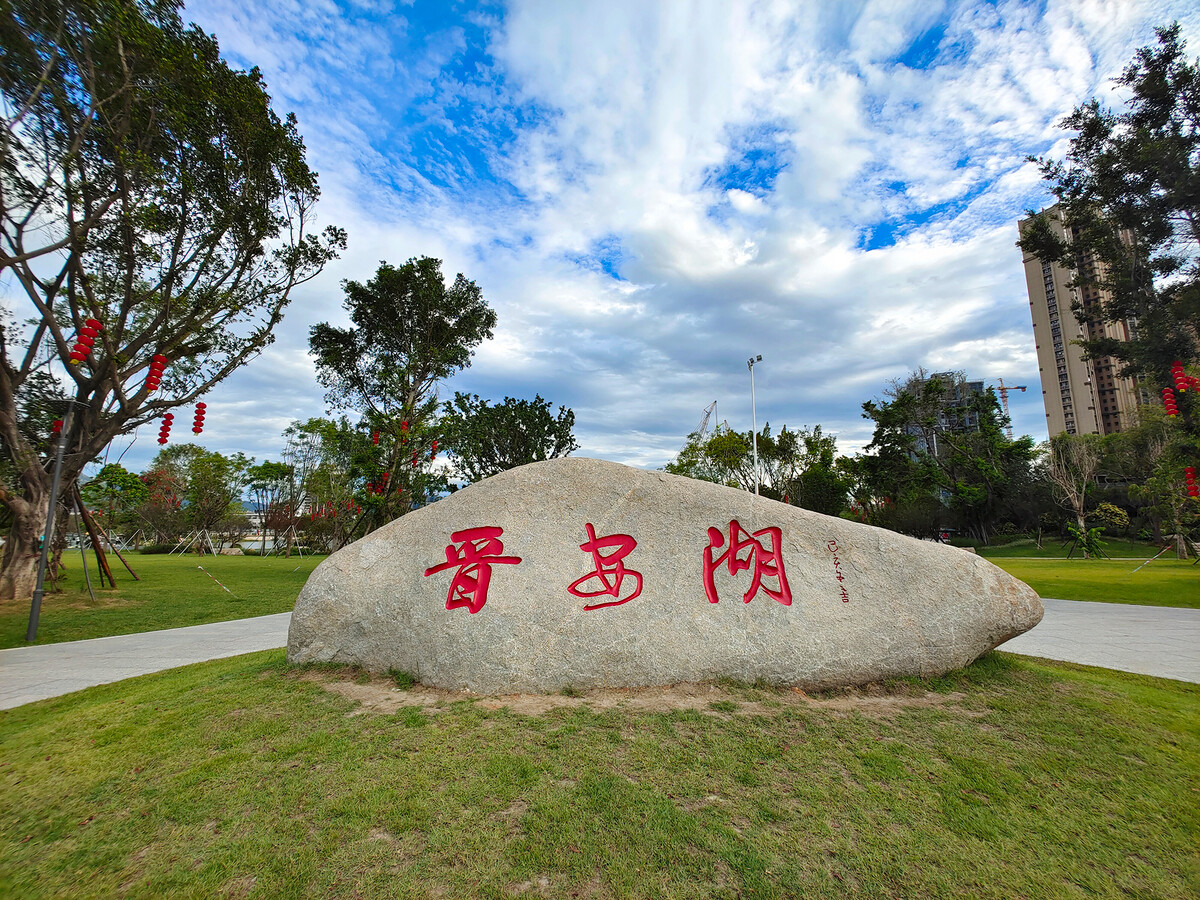 晋安湖公园北起化工路,东至龙安路,南延福新东路,西达东二环,总占地面积约930亩,其中陆上面积约320亩,水域面积约610亩。晋安湖与牛岗山山地公园、鹤林生态公园三个园区共同组成晋安公园,通过重构城市生态中轴线,融合公共文体设施,远借城外山景,内塑山水骨架,形成“北山南湖,一溪贯穿”的总体格局,是目前福州最大的城市综合性公园绿地,被誉为福州版的城市“中央公园”。