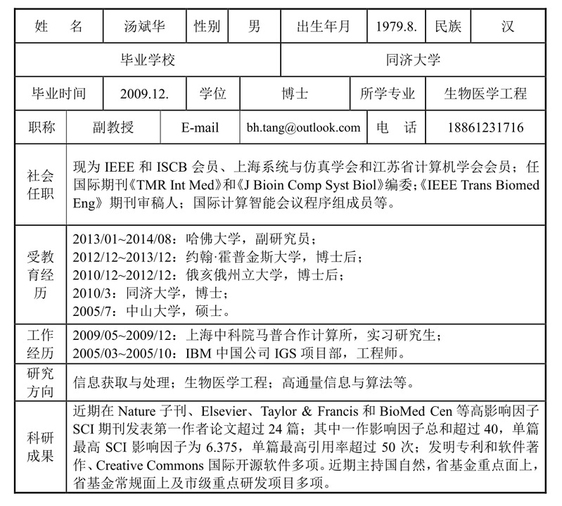 现为IEEE和ISCB会员、上海系统与仿真学会会员和江苏省计算机学会会员;任国际期刊《BMC Bioinf》编委;《IEEE Trans Biomed Eng》期刊审稿人;IEEE和Springer主办的ICIC和BMEI等国际会议审稿人。近期在Nature子刊、Elsevier、Taylor & Francis和BioMed Central等高影响因子SCI期刊发表第一作者论文超过40篇;其中一作影响因子总和超过100,单篇最高SCI影响因子超过10,单篇最高引用率超过200次;发明专利和软件著作、CreativeCommons国际开源软件多项;近期主持国自然,省基金重点面上,省基金常规面上,及市重点研发项目多项。