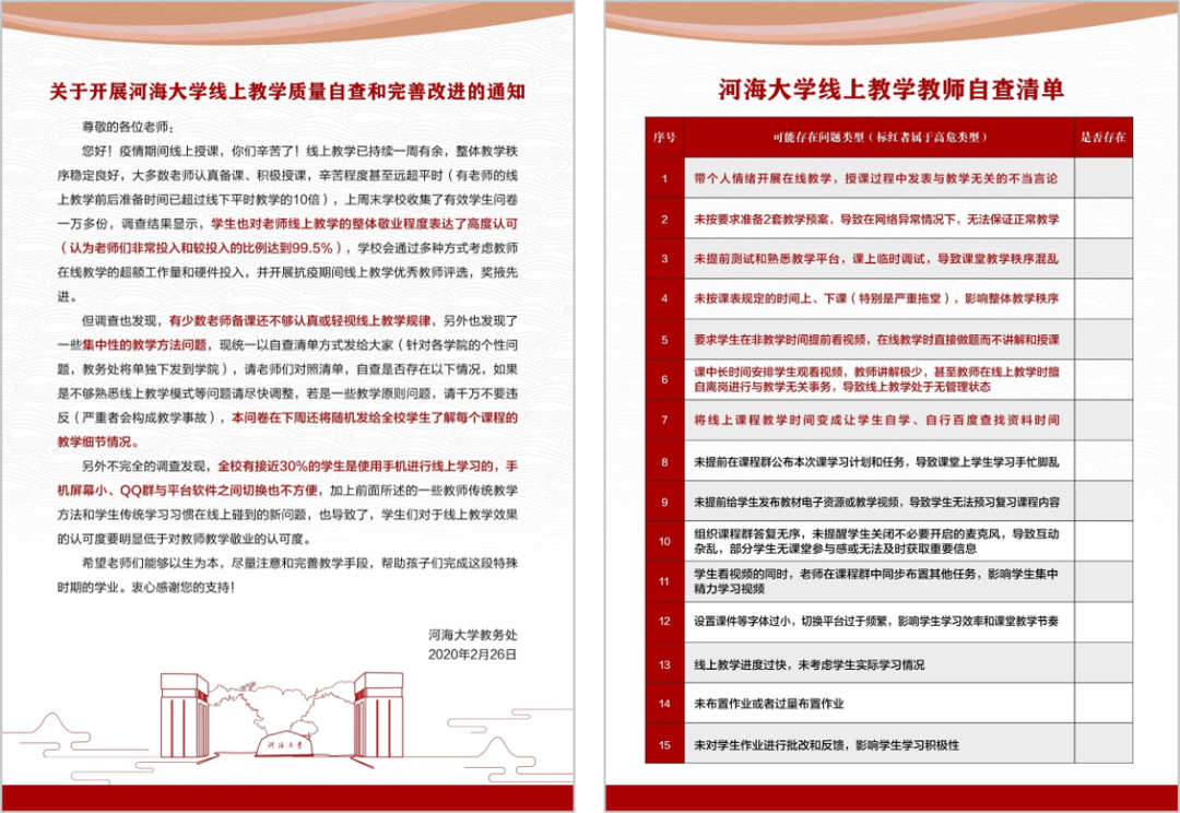 网格管理,质量监控。学校建立在线教学信息员服务网络,全体教学管理人员下沉到所有学院和在线教学一线,实时上线、实名进班,及时反馈学生学习诉求,回应教师教学关切。学校开展在线教学质量动态调查,设计在线教学教师自查对照表,根据调查结果适时调整检查重点,构建闭环迭代的在线教学质量反馈改进系统。