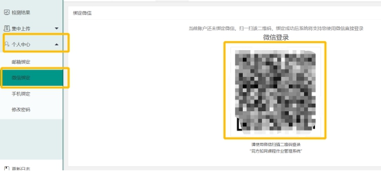 微信绑定功能简介。在登录系统后,如上图操作,扫描二维码后可以绑定微信。之后再登录系统,用微信扫一扫即可,不需要再输入账号密码了。