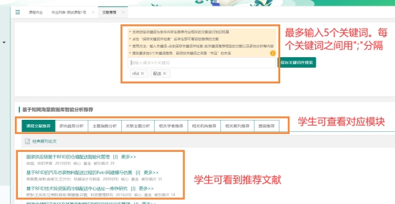 最多一次输入5个关键词,每个关键之间用”;“分割。推荐关键词后,学生可以在系统内,看到与关键词相关的经典、最新的期刊和硕博文献推荐;可以看到研究趋势分析;相关学者推荐;相关期刊推荐等。