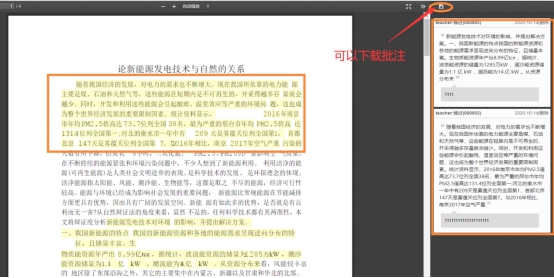 用鼠标框选作业正文内容,可以在线输入意见。点击右上方的下载按钮,可以下载“在线批注”。