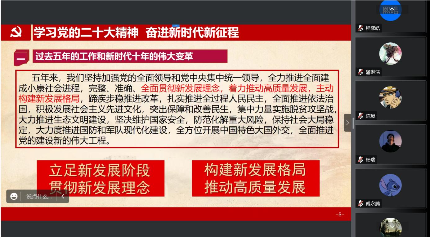首先,沈扬书记带领全体党员认真学习研读了党的二十大报告重要内容和精神。他指出,总书记的报告全面阐述了过去“极不寻常、极不平凡”的五年工作和新时代十年党和国家事业取得的历史性成就和发生的伟大变革,描绘了中国社会未来发展的宏伟蓝图,对以中国式现代化全面推进中华民族伟大复兴指明了前进方向,令人鼓舞、催人奋进。我们要以党的二十大精神为指引,牢记为党育人、为国育才的使命,心怀“国之大者”,全面贯彻党的教育方针,落实立德树人根本任务,聚焦国家发展所需,基于“以生为本”的教育理念,提升人才培养质量,努力培养出堪当民族复兴大任的时代新人。在新起点新征程上,我们所有党员同志都要发扬奋斗精神,埋头苦干、担当作为,将个人理想融入于党和人民的伟大事业中,争取交出一份令人满意的优秀答卷。