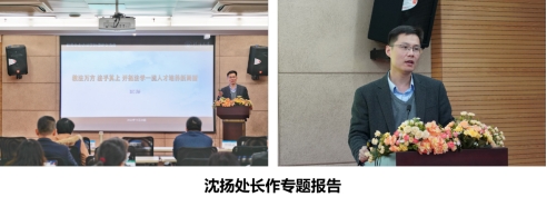 教务处交流报告环节,沈扬处长作《教法万方,法乎其上,开拓法学一流人才培养新局面》专题报告。他首先对法学院全体教师为本科教学的辛苦付出表示衷心感谢,对法学专业获批国家级一流专业建设点表示热烈祝贺。在报告中,他传达了教育部审核评估基本思想与专业认证OBE理念高度相通的精神,介绍了OBE理念的思想内核,解析了三级专业认证体系下文科专业认证的意义与举措,希望法学专业能够成为江苏地区第一个完成长三角新文科教育专业认证的法学专业。从质保体系构建的关注重点出发,解读了培养目标、毕业要求及课程体系间的逻辑关系,强调了全面推行新版课程小结、开展课程考核达成度分析的重要意义与实施路径,引导学院教师充分理解、有效执行、高效推进人才培养质保体系落实落细,鼓励大家结合法学专业人才培养的特点,构建专业层面课程思政体系与全局观的混合式教学模式。同时,借助纵、横向数据对比,客观分析了法学院在专业建设、新文科项目等方面取得的成绩,以及在课程建设、教材建设等方面存在的问题与改进的方向,真切希望学院积极探索符合专业特色的发展道路,实现全方位高质量内涵式发展。最后,他表示教务处将继续全力支持法学院在专业发展和建设上的工作,欢迎广大老师对教务处工作给予监督并建言献策。
