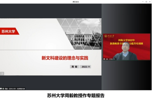 苏州大学周毅教授作《新文科建设的理念与实践》专题报告。报告解读了新文科建设提出的背景及战略意义,从新文科的特征、理念、目标等方面阐释了新文科的深刻内涵,梳理并总结了国内外高校在新文科探索方面的实践案例。最后介绍了苏州大学在新文科建设中的思路,展示了为老专业赋予新内涵以及开创全新办学模式等具体举措,为老师们开创文科教育创新体系、开展新文科实践探索提供参考和借鉴。