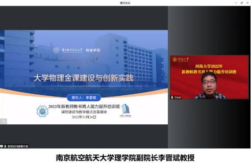 11月24日,我校举行2022年新教师教书育人能力提升培训班之模块三(课程建设与教学模式改革),西北工业大学教学研究与教师发展中心主任李辉教授,苏州大学周毅教授和南京航空航天大学理学院副院长李晋斌教授出席线上活动并作专题报告。我校近一年新入职并从事教育教学工作的专任教师、辅导员和独立承担教学任务的专业技术人员,及部分参与课程建设、四新建设教学改革的教师共147人在线参加了本次培训。本期培训活动由教务处副处长朱金秀主持。