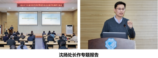 教务处交流报告环节,沈扬处长作《放眼天地融会贯通勇登人才培养新高地》专题报告。他首先对地球科学与工程学院全体教师为本科教学的辛勤付出及卓有成效的工作表示衷心感谢。在报告中,沈扬处长从工程教育走过技术范式、科学范式、工程范式和创新融合的发展历程,引出人才培养的时代任务,并指出课程是本科教学改革工作的灵魂。他表示,即将到来的审核评估,其基本思想与专业认证的OBE理念高度相通,学院作为在全校较早开展专业认证并取得显著成效的学院,应发挥先锋示范作用。他也从学校、专业两个层面详细生动阐述了OBE理念思想内核及实践路径,特别强调了校院协同构建以学生学习成果为导向的教育教学质量保障体系对学校人才培养工作提升的重要作用。同时,沈扬处长通过纵横向数据对比,客观分析了学院在专业建设方面取得的成绩,以及在课程建设、教学改革等方面需要继续发力的方向。最后,他表示教务处将继续全力支持学院在专业发展和建设上的工作,并欢迎广大教师在教务处提供的多条沟通渠道中对教务处工作广泛监督并建言献策。