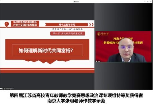 第四届江苏省高校青年教师教学竞赛思想政治课组特等奖获得者、南京大学张明老师以课程《毛泽东思想和中国特色社会主义理论体系概论》的教学节段《如何理解新时代共同富裕?》为例进行教学示范展示。结合新闻报道、国内外官方数据,重点突出、条理清楚地介绍了新时代共同富裕的深刻内涵和成效举措,用富有感染力的语言表达和情感展现了青年教师的风采。