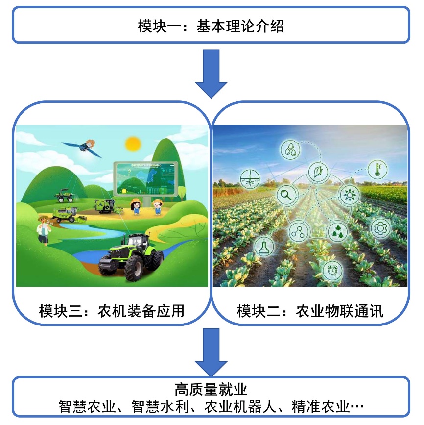 模块三:农机装备应用。《农业机器人》、《智能农机装备》和《智能农业装备实习》为核心,讲授农林机器人技术原理、种类和传感器、设计制作方法,以及当前智能农机装备技术水平、智能农机装备的结构及种类相关知识。