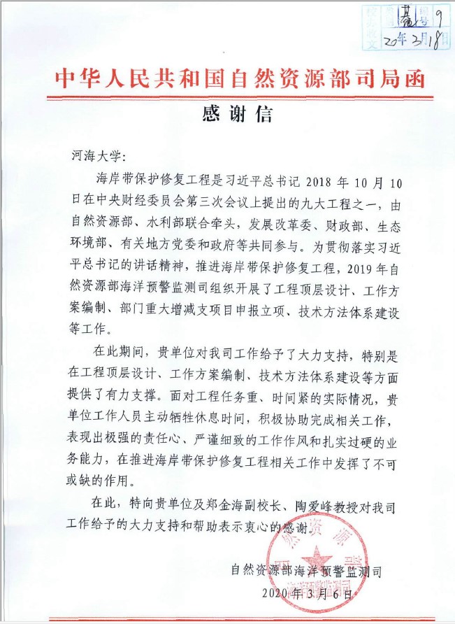 感谢函中提及:海岸带保护修复工程是习近平总书记2018年10月10日在中央财经委第三次会议上提出的九大工程之一,由自然资源部、水利部联合牵头,发展改革委、财政部、生态环境部、有关地方党委和政府等共同参与。为贯彻落实习近平总书记的讲话精神,推进海岸带保护修复工程,2019年自然资源部海洋预警监测司组织开展了工程顶层设计、工作方案编制、部门重大增减支项目申报立项、技术方法体系建设等工作。在此期间,港航院郑金海教授和陶爱峰教授对该工作给与了大力支持,特别是在工程顶层设计、工作方案编制、技术方法体系建设等方面提供了有力支撑。面对工程任务重、时间紧的实际情况,他们主动牺牲休息时间,积极协助完成相关工作,表现出极强的责任心、严谨细致的工作作风和扎实过硬的业务能力,在推进海岸带保护修复工程相关工作中发挥了不可或缺的作用。