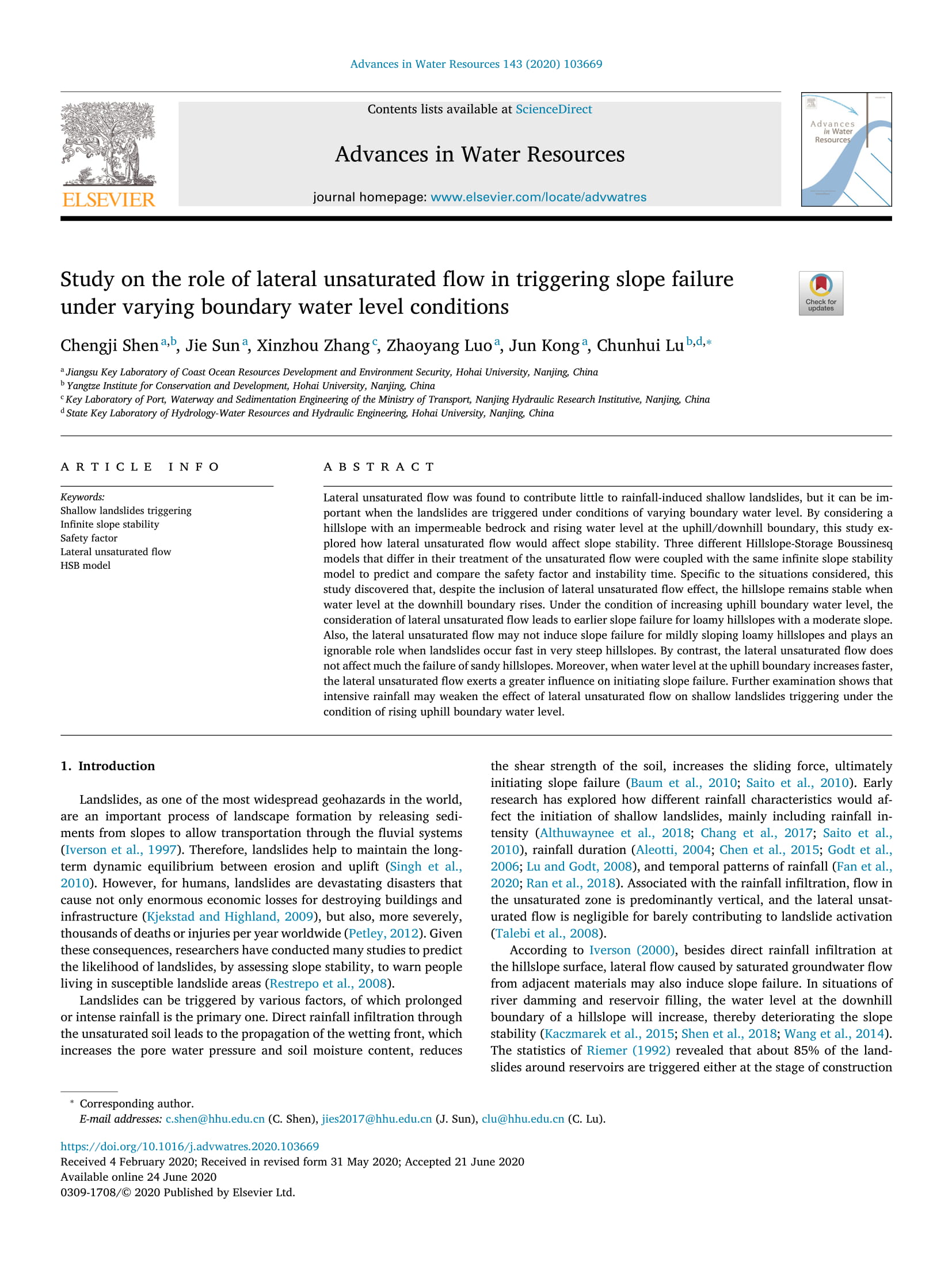 近日,港航院海防所教师孔俊教授团队在国际权威期刊《Advances in Water Resources》上发表了题为“Study on the role of lateral unsaturated flow in triggering slope failure under varying boundary water level conditions”的学术论文。