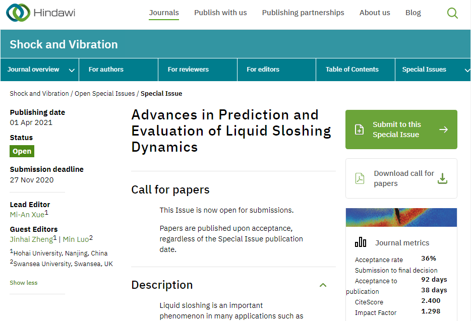 港航院薛米安教授、郑金海教授、英国Swansea University罗敏博士受邀担任国际学术期刊《Shock and Vibration》客座主编,组织专刊“Advances in Prediction and Evaluation of Liquid Sloshing Dynamics(液体晃荡动力过程研究进展)”,旨在征集最新的预测和评估液体晃荡载荷和海洋结构响应及两者耦合效应的研究成果,以及相关综述性文章。