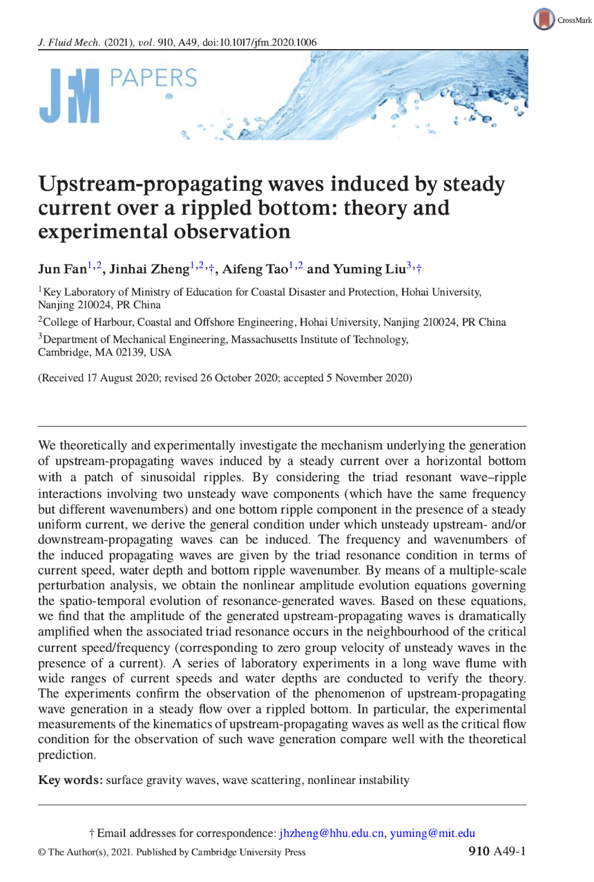 论文链接:Jun Fan, Jinhai Zheng, Aifeng Tao, Yuming Liu. Upstream-propagating waves induced by steady current over a rippled bottom: theory and experimental observation. http://dx.doi.org/10.1017/jfm.2020.1006