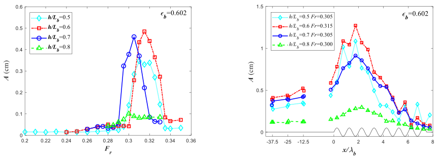 连续沙波广泛存在于河口海岸地区,它与水流、波浪的相互作用机制十分复杂,虽然现场和实验室都有观测到水流经过连续沙波地形会产生逆流行进波的现象,但是其激发条件和成长机制一直没有得到理论上的解释。研究团队采用多重尺度展开的奇异摄动解析,推导出连续沙波地形上逆流行进波振幅的空间分布理论解(图1),设计并开展348组波流水槽试验,发现在相对水深0.5~1.0和弗罗德数0.20~0.34的范围内,亚临界水流经过连续沙波地形时会激发逆流行进波;总结出逆流行进波的波幅、波数与频率等波要素随水流与地形条件的变化规律与空间分布,表明波幅随流速增大呈现单峰分布并体现出明显共振特征(图2-左),在沙波地形上部波幅以指数形式增长(图2-右)。理论解析与水槽试验观测相结合,阐明了逆流行进波的波形产生与成长机制是基于沙波和波相位逆流传播的两个波组成的三波共振组合与地形上部水流流速接近共振波的极限流速条件的联合作用(图3)。研究工作得到国家杰出青年科学基金(51425901)的资助。