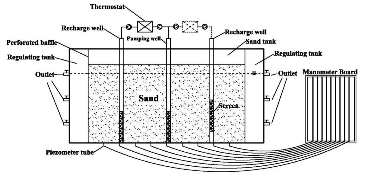 地下水源热泵(GWHP)以地下水为热源,具有高效节能,污染小等优点。目前,学者们对地下水源热泵系统换热规律的数值模拟研究较多,但在基于有限元或有限差的数值计算中对井结构的处理较为简单,难以对其进行精准刻画,包括井径、抽灌井滤水管长度、抽灌井滤水管高差,与实际情况都存在一定差距,在水-热耦合作用下抽灌井结构对地下水源热泵换热影响规律的物理试验方面的研究尚不完善。