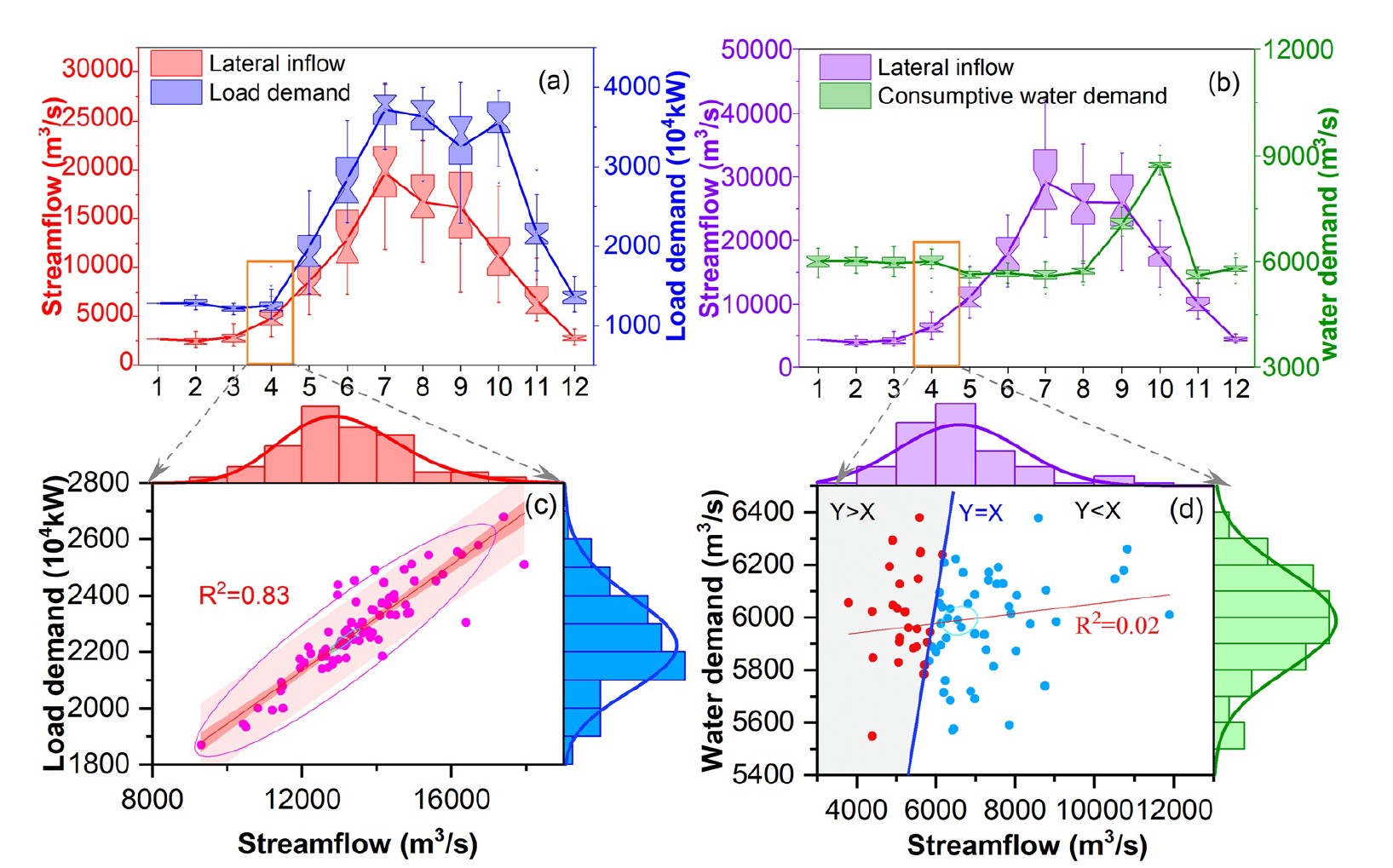 图1. 多重不确定因子的情景集箱线图:(a)三峡区间入流与梯级总负荷的情景集;(b)三峡天然入流与河道外需水流量过程的情景集