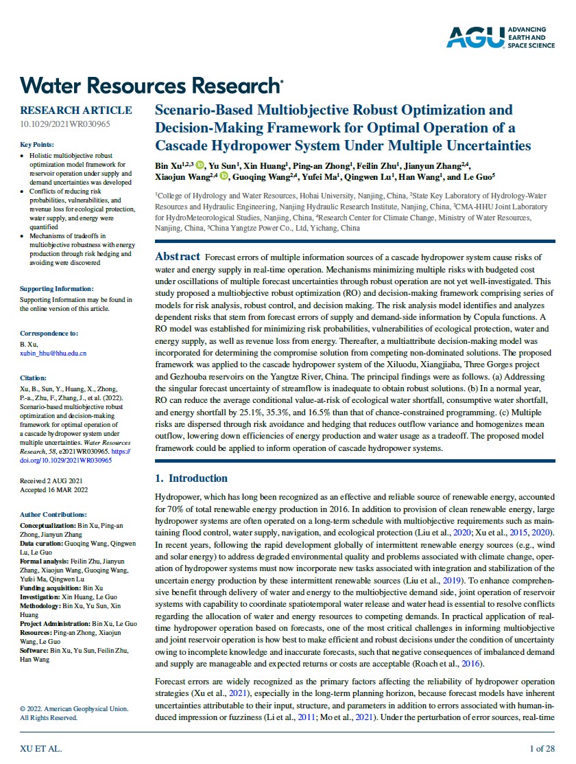 近日,我院青年教授徐斌在水资源领域顶级权威期刊《Water Resources Research》上发表题为“Scenario-based multiobjective robust optimization and decision-making framework for optimal operation of a cascade hydropower system under multiple uncertainties”的研究论文。该论文建立了一套应对多重不确定性影响的梯级水库群的多目标鲁棒优化与决策模型。