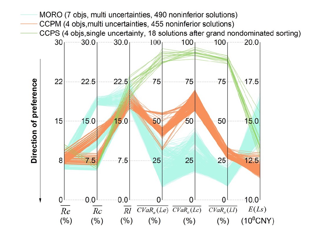 图2. 三种模型的非劣解方案集结果:鲁棒优化模型、机会约束规划模型(多风险源)、机会约束规划模型(单一风险源)