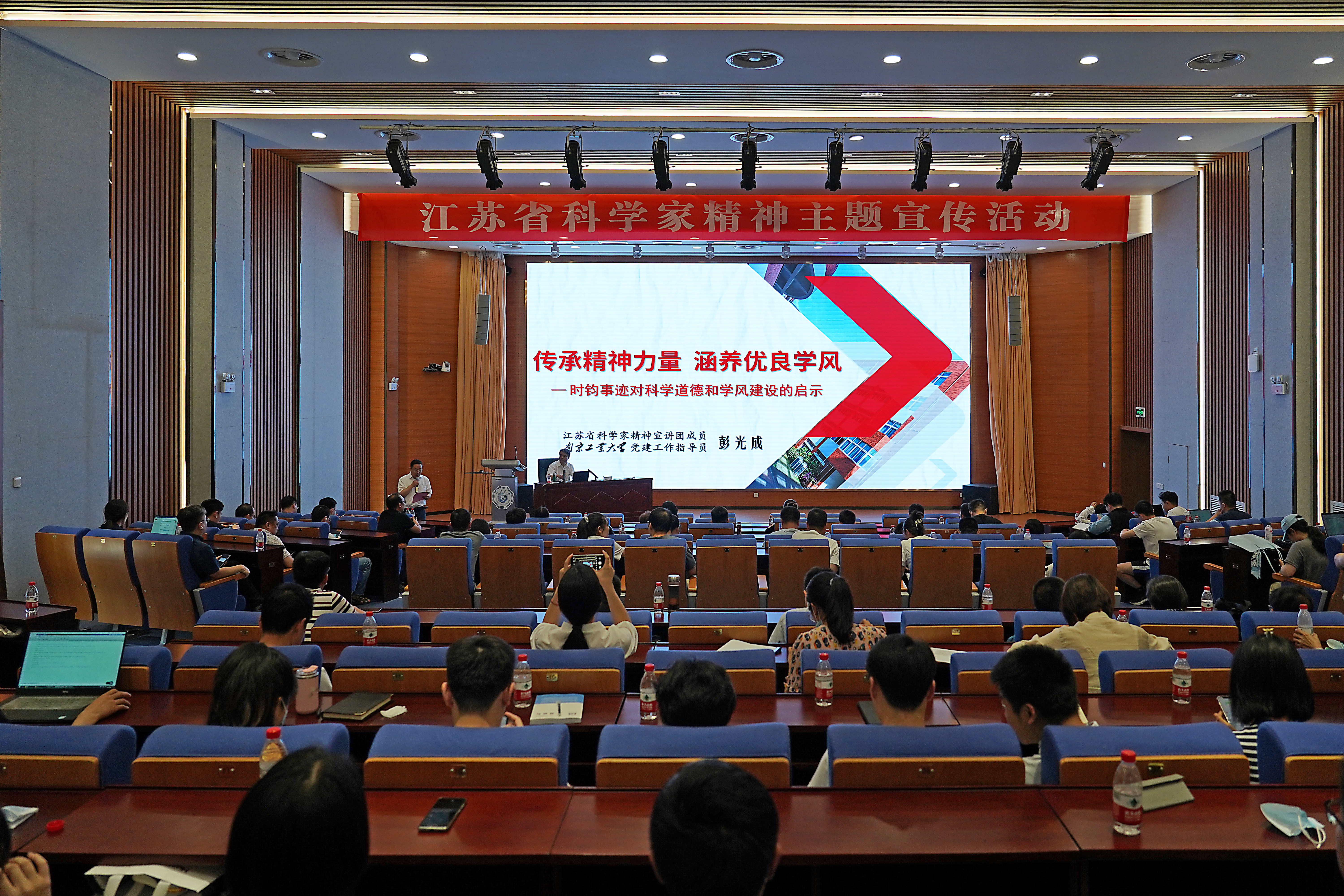 为弘扬科学家精神,引导我校科技工作者身怀爱国之心、砥砺爱国之志,争做重大云开电竞app下载地址的创造者、建设科技强国的奉献者、崇高思想品格的践行者、良好社会风尚的引领者,近日,我校举办2022年“全国科技工作者日”江苏科学家精神主题宣传活动。江苏省科学家精神宣讲团成员彭光成教授应邀做了题为《传承精神力量 涵养优良学风》的科学家精神主题报告。他从著名化学工程学家时钧先生及其优秀事迹入手,娓娓道来,分享了时钧院士背后不为人知的精彩和感人至深的故事,诠释了爱国、创新、求实、奉献、协同、育人的科学家精神。我校青年教师,一线科技管理人员100余人,聆听了本次报告会,并结合自身工作和学习畅谈体会感想。