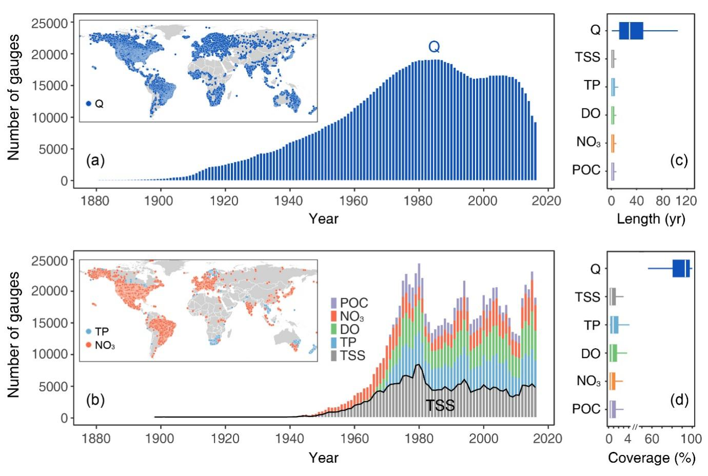 图1.全球监测站点的发展历程和数据分布。(a)水文站点和径流数据和 (b)水质站点和代表性的水质变量。