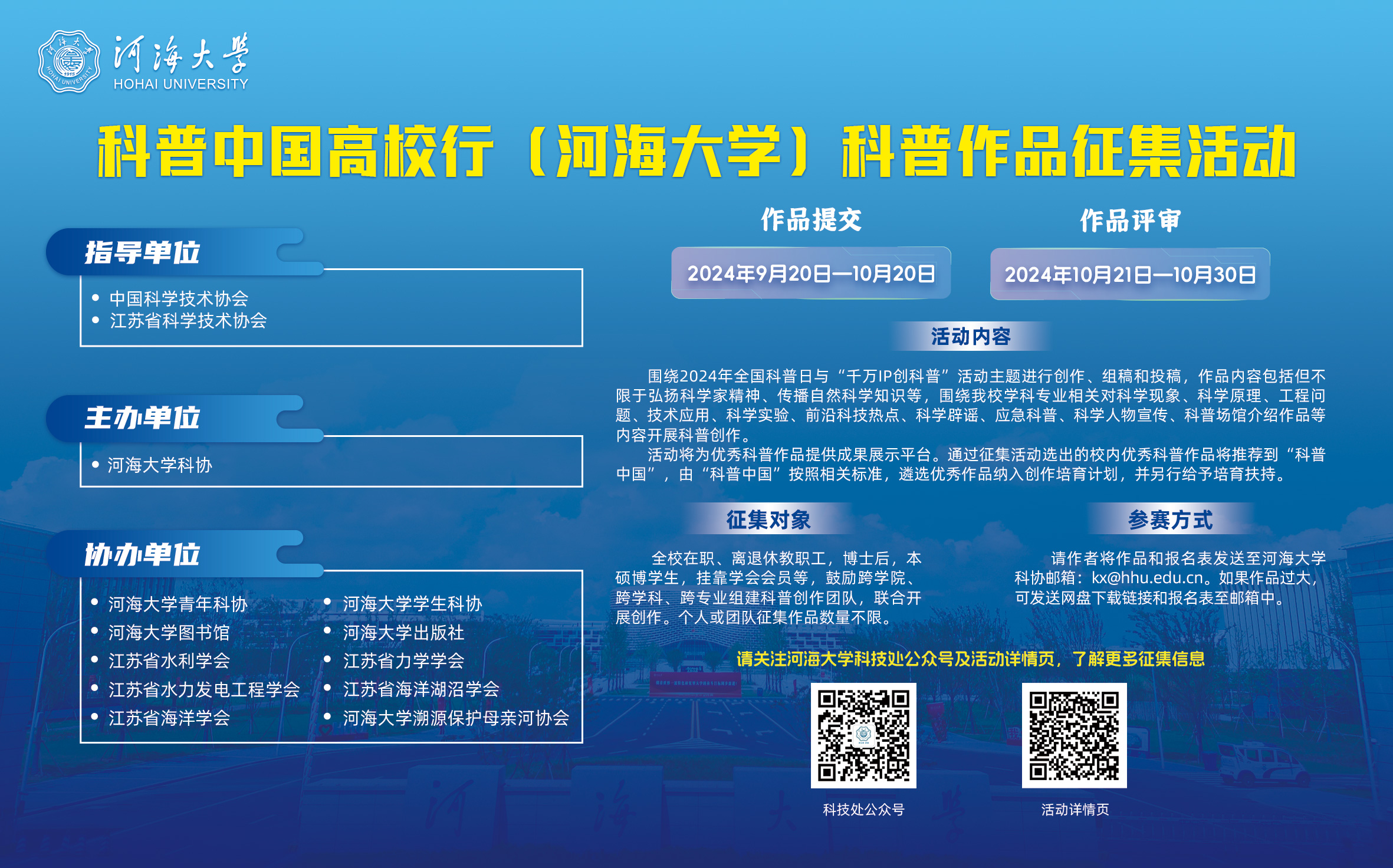 围绕2024年全国科普日与“千万IP创科普”活动主题进行创作、组稿和投稿,作品内容包括但不限于弘扬科学家精神、传播自然科学知识等,围绕我校学科专业相关对科学现象、科学原理、工程问题、技术应用、科学实验、前沿科技热点、科学辟谣、应急科普、科学人物宣传、科普场馆介绍作品等内容开展科普创作。