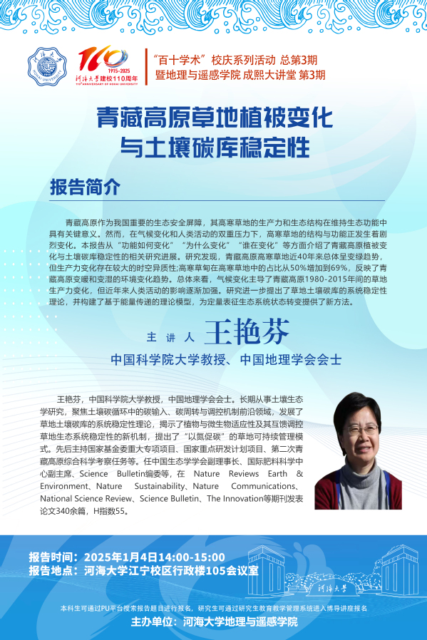 “百十学术”系列活动第3期——王艳芬教授:青藏高原草地植被变化与土壤碳库稳定性