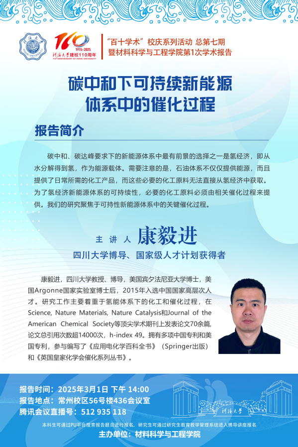 “百十学术”系列活动第7期——康毅进教授:碳中和下可持续新能源体系中的催化过程