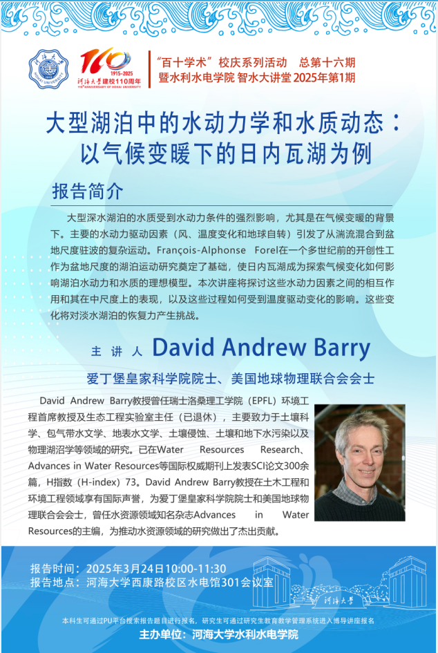 “百十学术”系列活动第16期——David Andrew Barry:Hydrodynamics and Water Quality Dynamics in Large Lakes: Insights from Lake Geneva under Climate Warming